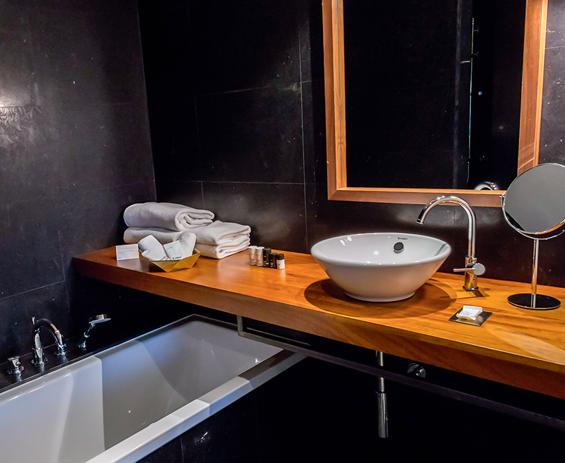 I min suite var der både badekar og en stor brusekabine med regnbruser i det kulsorte badeværelse i delvist åbent plan. Badekåberne og håndklæderne er i luksuskvalitet på Dear Hotel, og der var rigeligt med gratis badeprodukter af god kvalitet. Dear Hotel har også tænkt på ekstra detaljer som et makeup-spejl og lysestager ved badekarret.