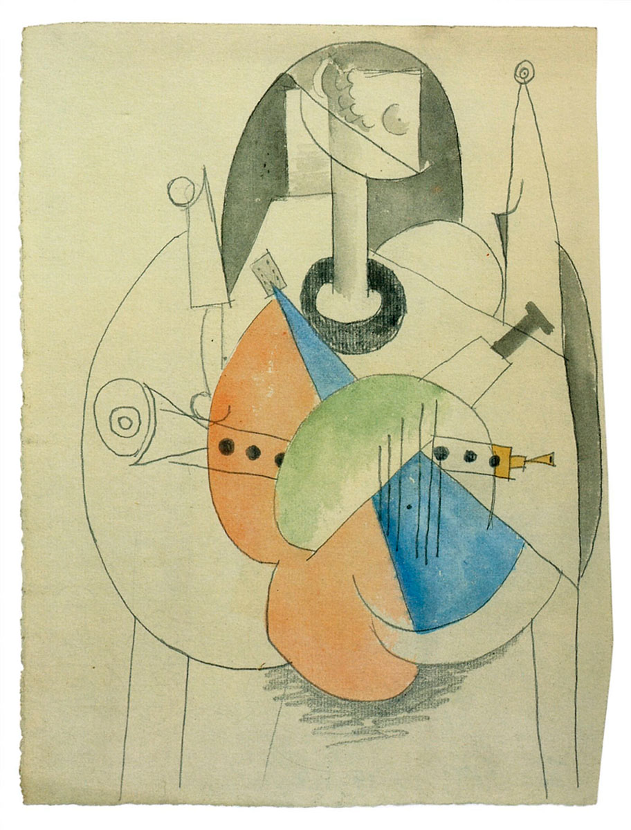 The exhibitionconsists of around 100 works that show how Galicia has left its mark on the artist’s works. Several of the works are brought to the exhibition from elsewhere. These include the painting Instruments et musique et compotier sur une table, which portrays bagpipes. The painting belongs to the collection of the Picasso Museum in Málaga.