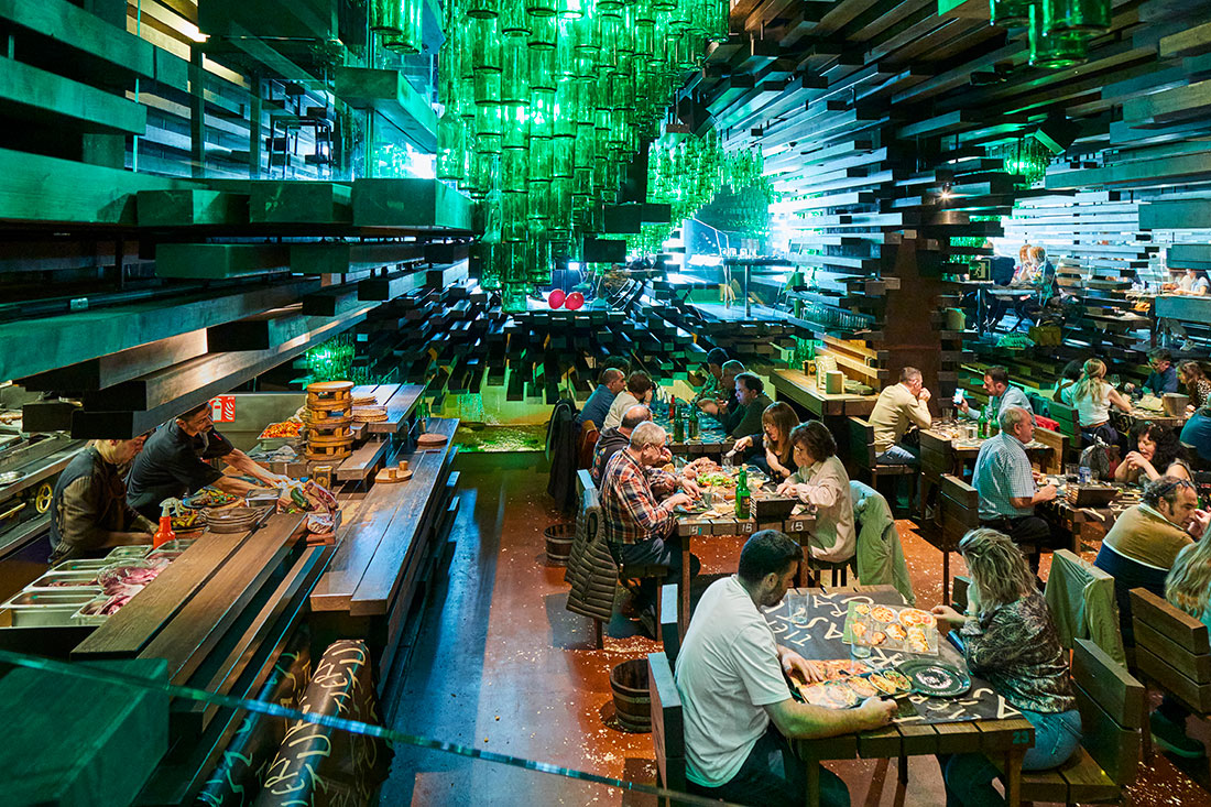 Tierra Astur er gennemført asturisk stemning, fordelt over to etager. Her hænger grønne ciderflasker ned fra loftet over træborde og -stole.