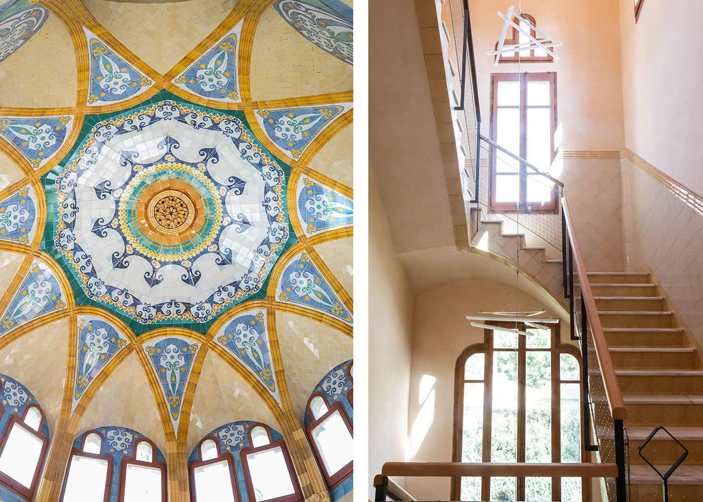 Bemærk også trappesatserne mellem etagerne med fantastiske former og udsmykninger. Kig også op i loftet i bygningens kroge, som har fantastisk udsmykket flisearbejde, samt på vinduer og døre, der er udført i gedigent træ i buede former.